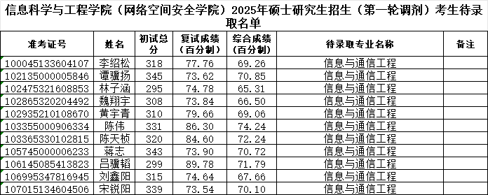 色色啦 (网络空间安全学院)2025年硕士研究生招生第一批调剂考生拟录取名单(2)