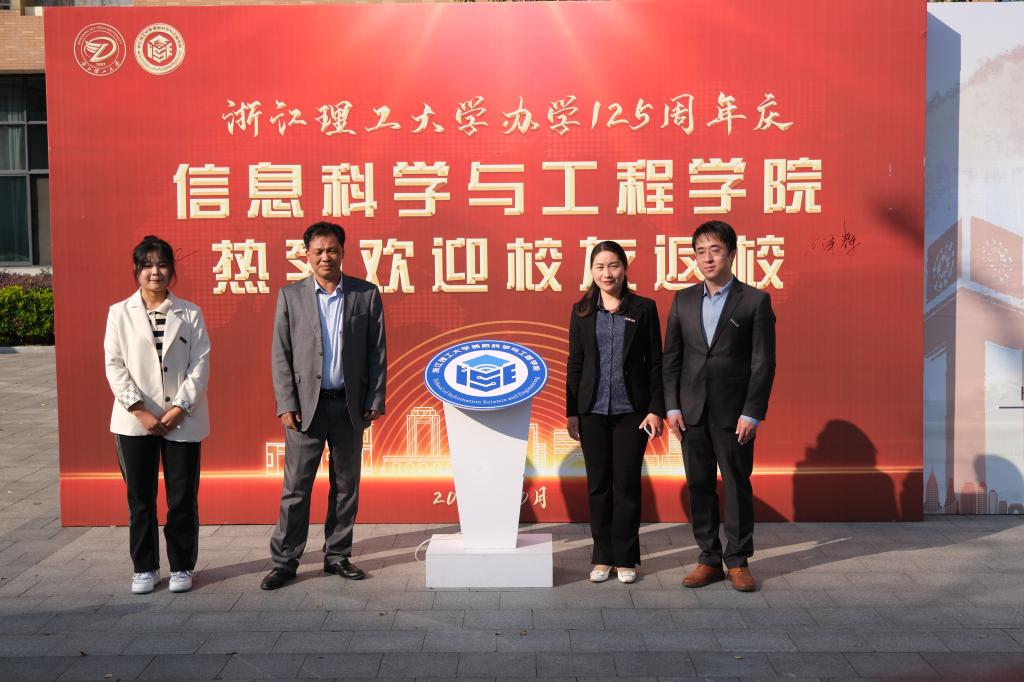 苏丽辉、沈剑、徐昌国和学生代表潘倩倩为学院院徽揭幕。以此为始,学院将不断加强校友文化建设,弘扬拼搏奋斗精神,凝聚学院发展新动力。时值学校125周年校庆,学院邀请了同在10月份生日的老师和学生代表,举办集体生日会,共庆浙理125华诞。