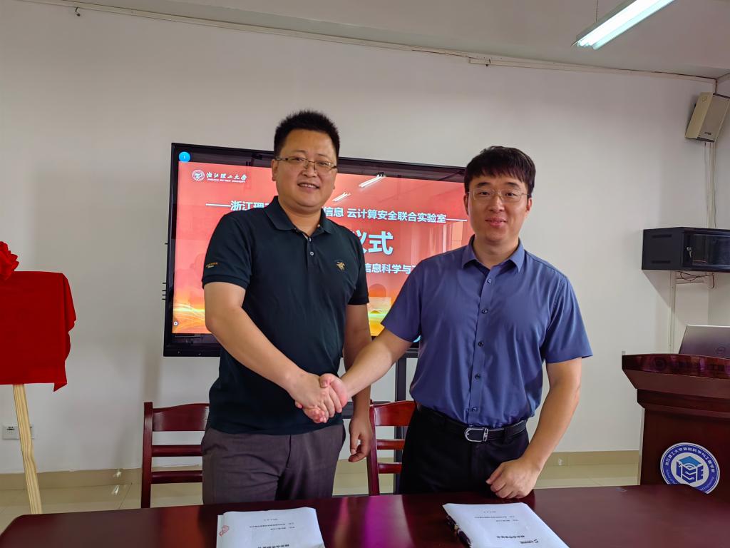 与安恒信息技术股份有限公司签约成立云计算安全联合实验室。科技处副处长吴震宇、学院党委书记苏丽辉、院长沈剑、副院长童基均、赵新龙、副书记许丽芬出席签约仪式。安恒信息技术股份有限公司高级副总裁兼首席人才官苗春雨、副总裁兼数字人才创研院副院长吴鸣旦、浙江区域教育医疗负责人彭实与高级副总裁助理杜妍参加签约。