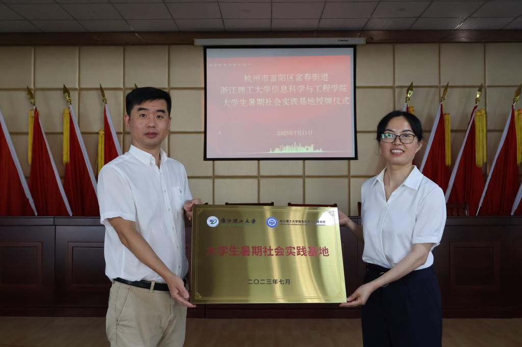 与富阳区富春街道达成一致意向建立大学生暑期社会实践基地,7月11日下午,实践基地授牌仪式在富春街道春华村党群服务中心会议室举行。