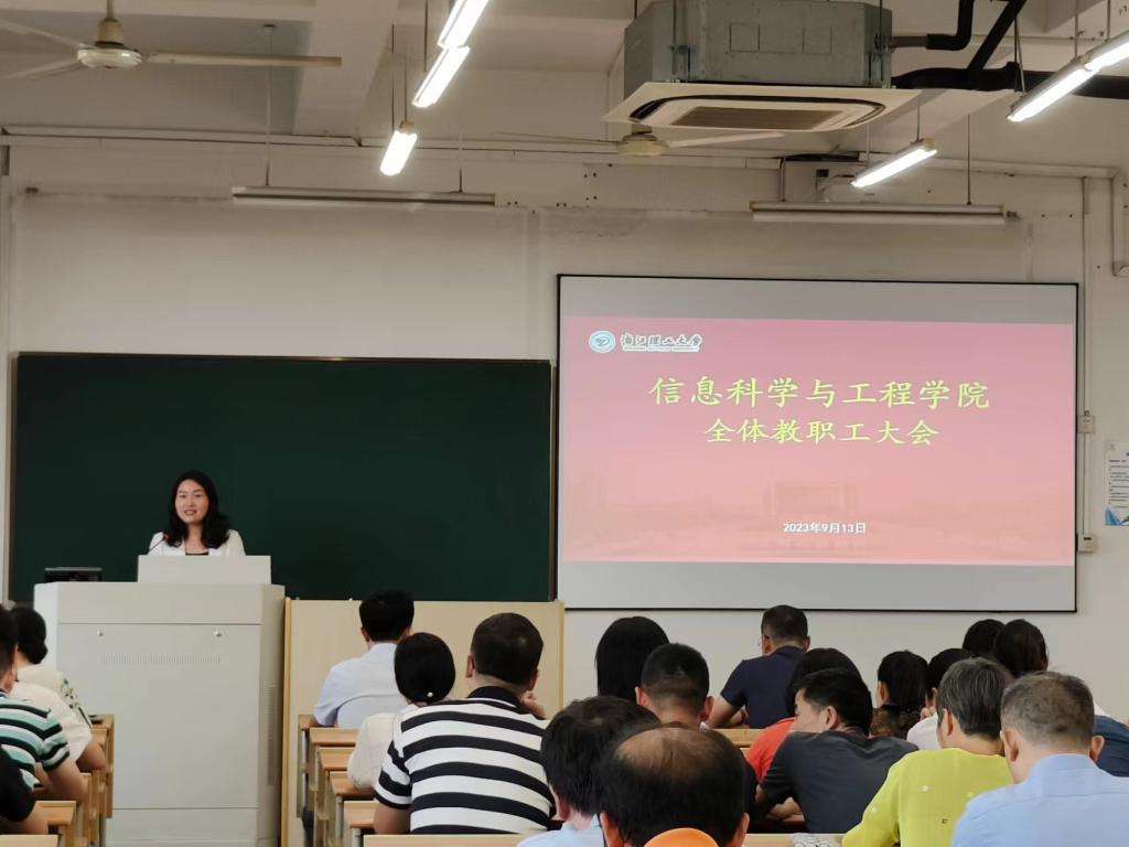 党委书记苏丽辉向全体教职工传达了全省高等教育强省暨高水平大学建设工作推进会、学校高质量发展重要监测指标推进会暨主题教育调研成果交流会、学校安全责任人会议暨亚运会安全部署会议等重要会议精神,要求全院教职工认真学习领悟,以会议精神指导各项工作落实。