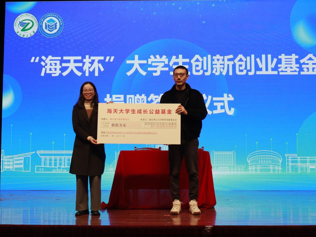 为深化学生创新创业理念,激发学生创新创业热情,助力学生创新创业梦想,会上进行了“海天杯”大学生成长公益基金捐赠签约仪式。