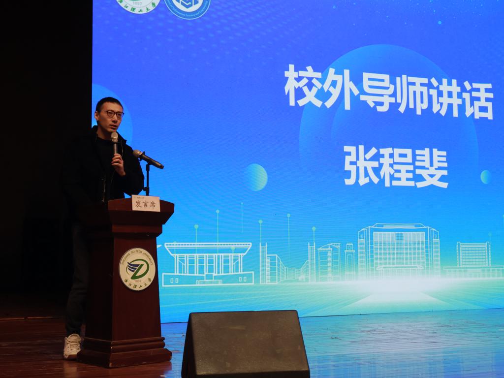 校外导师张程斐讲话。张程斐介绍了浙江海天塑机集团有限公司及海天慈善基金的基本情况,希望同学们能够向今天受到表彰的优秀学子看齐,抓住时代机遇,努力学习专业知识,成长为对社会和国家有用的专业人才。