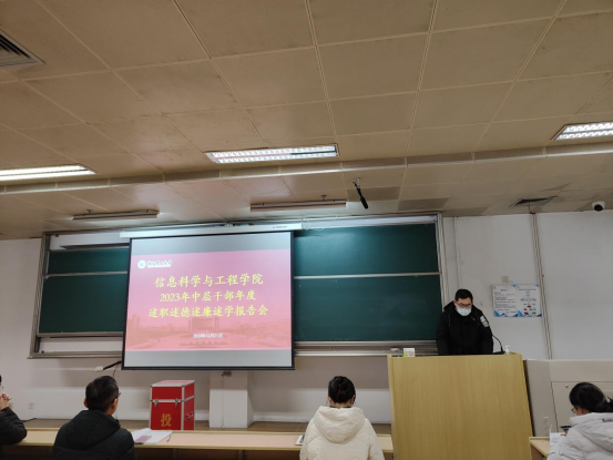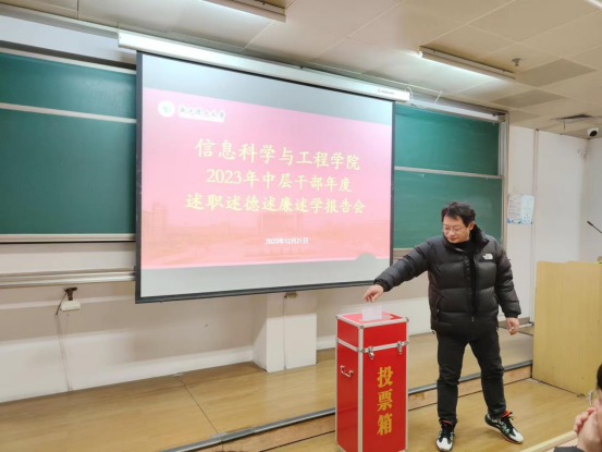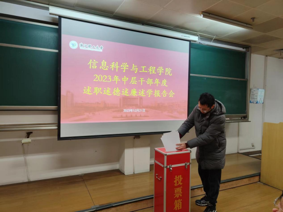 会议第一阶段,举行2023年度学院中层干部述职述德述廉述学报告会,全体参会教职工按照组织部的要求开展现场测评,校党委组织部赵婉颖老师现场指导。