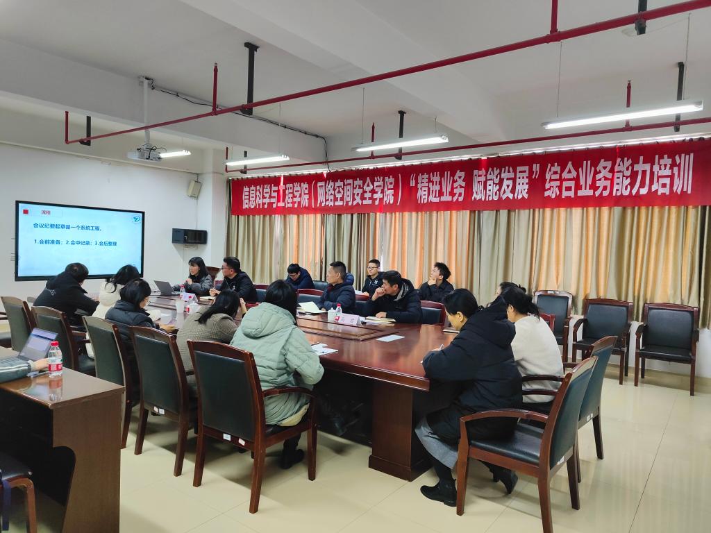 (网络空间安全学院)于1月10日下午在25号楼1210会议室举办“精进业务,赋能发展”综合业务能力培训。此次培训邀请了建筑工程学院党委委员、副书记,纪委委员、书记(曾任校办文秘科科长)朱何旋、校办文秘科文字秘书章飚、宣传部理论教育科干部郭超以及学院党委组织员高君进行专题宣讲。学院内设机构负责人、教工党支部书记及支委、行政办公人员等参加了此次培训。培训由学院党委副书记许丽芬主持。