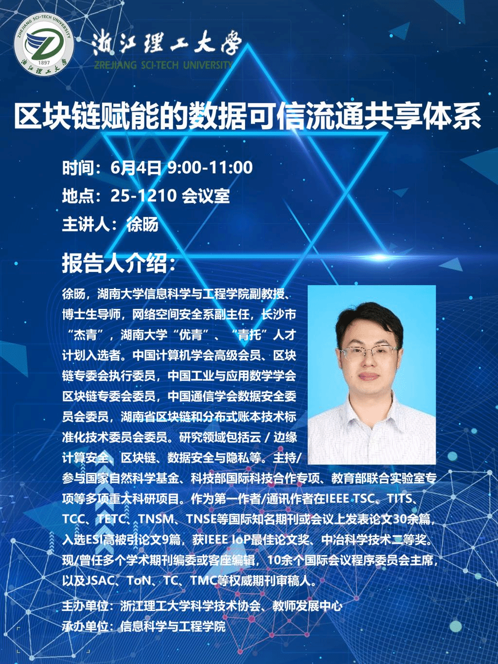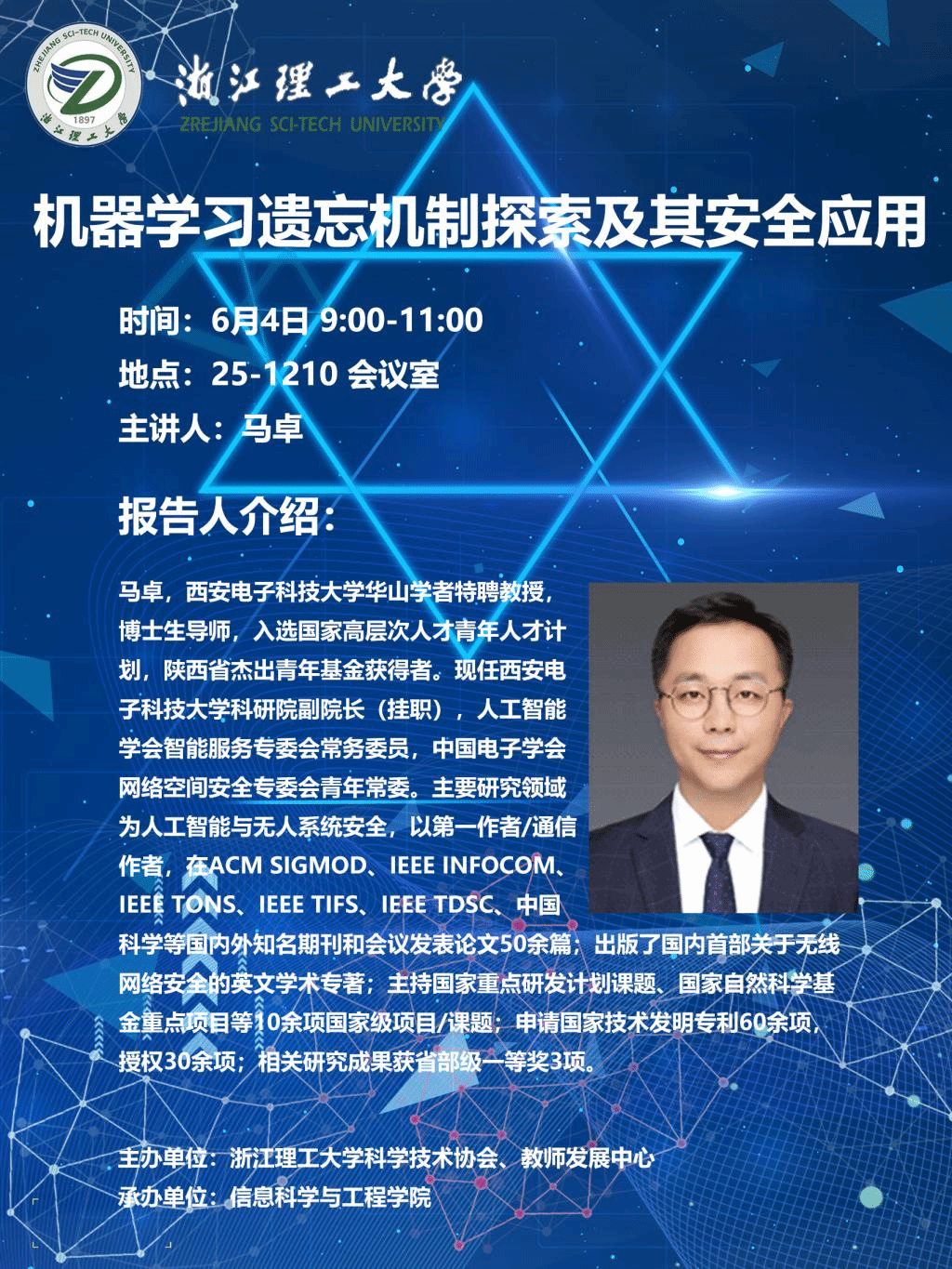 6月4日上午,学院邀请了西安电子科技大学华山学者特聘教授、国家高层次人才青年人才计划马卓,西安电子科技大学二级教授李兴华,广州大学百人计划突出学科带头人、重庆市科技创新领军人才徐光侠,湖南大学“优青”、“青托”人才计划入选者徐旸等四位教授来色色啦 进行学术交流,并在25号楼1210会议室为师生分别作题为“机器学习遗忘机制探索及其安全应用”、“无线网络隐私保护关键技术研究”、“区块链共识机制研究”、“区块链赋能的数据可信流通共享体系”的学术报告。