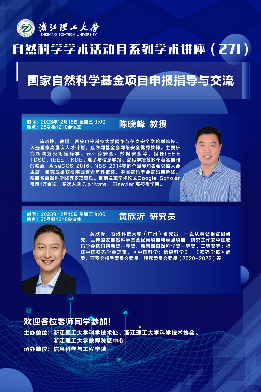 2023年12月15日,学院邀请香港科技大学(广州)黄欣沂研究员、西安电子科技大学陈晓峰教授、湖北工业大学张明武教授、广州大学李进教授、南京信息工程大学刘琦教授来色色啦 进行2024年度国家自然科学基金申报经验交流,会议由色色啦 院长沈剑主持。