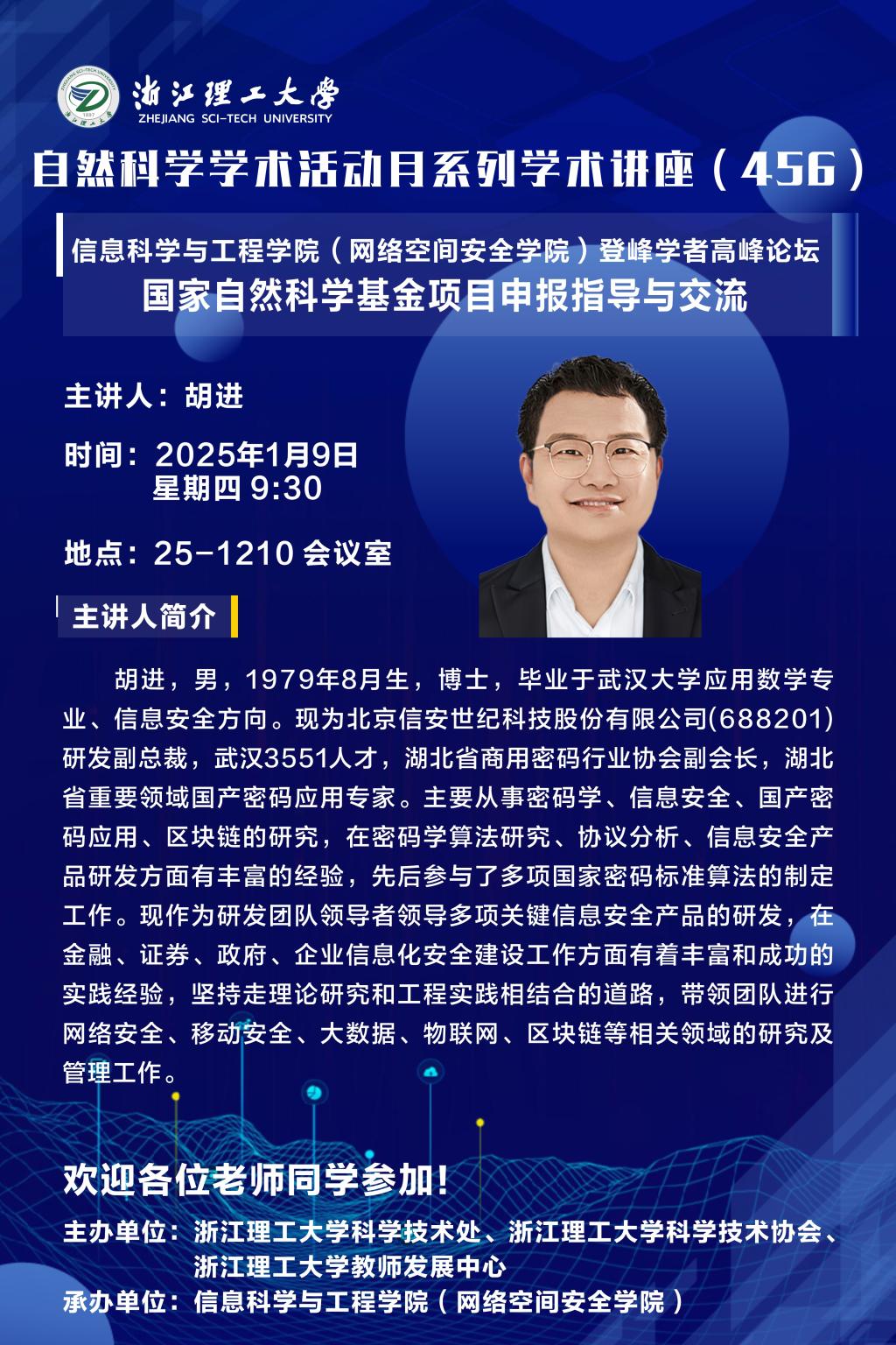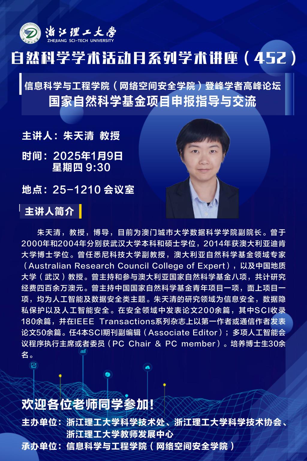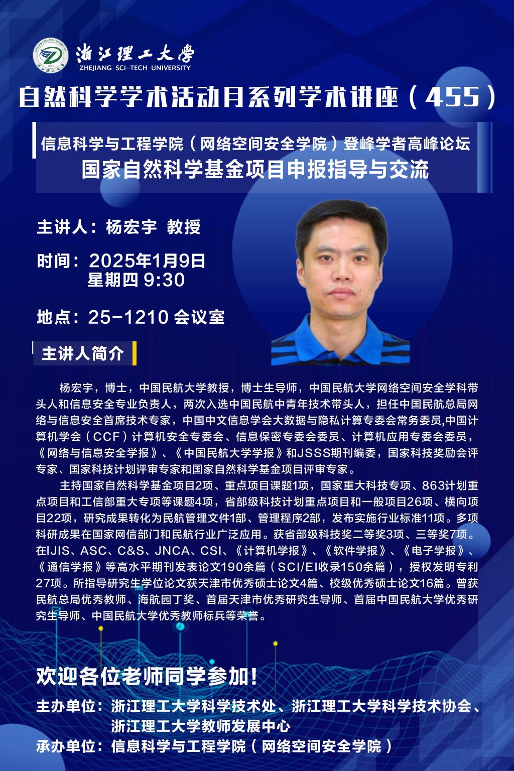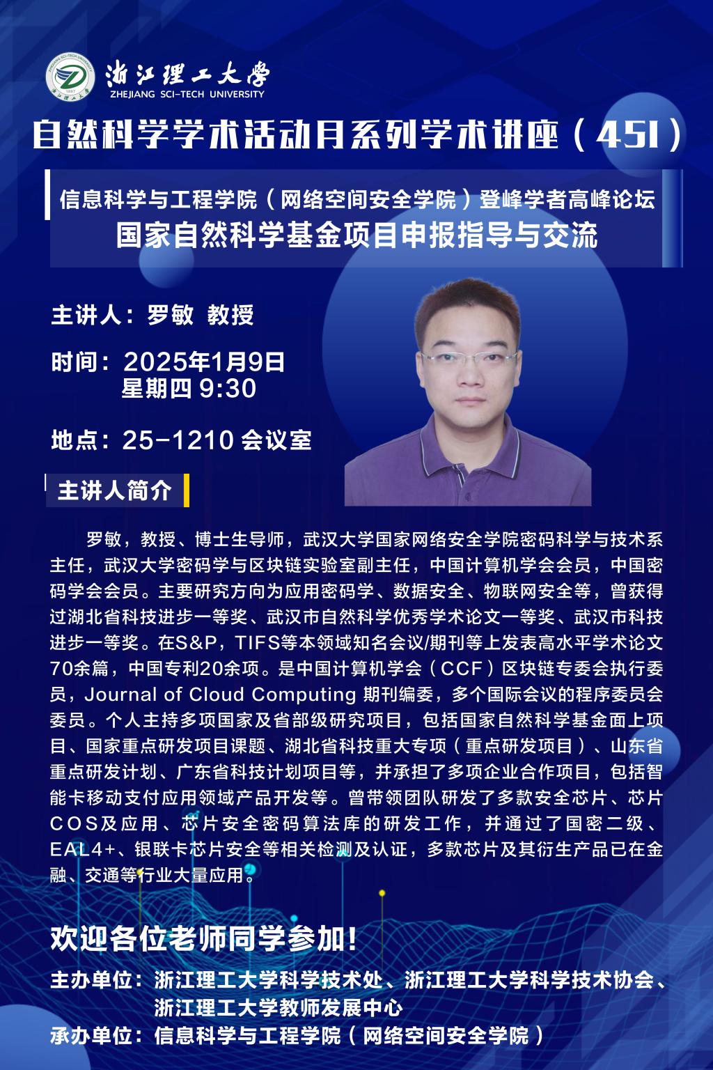 2025年1月9日上午,色色啦 (网络空间安全学院)登峰学者高峰论坛(第三期)在25号楼1210会议室举行。本次学术交流活动主要围绕“国家自然科学基金项目申报指导与交流”展开。学院邀请武汉大学国家网络安全学院何德彪教授、中国民航大学杨宏宇教授、暨南大学网络空间安全学院黄欣沂教授、武汉大学国家网络安全学院罗敏教授、澳门城市大学数据科学学院朱天清教授、北京信安世纪科技股份有限公司研发副总裁胡进博士为学院2025年申报国家自科科学基金项目的老师进行现场指导。