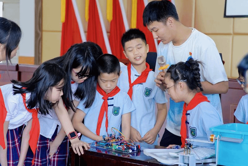 党课结束后,大、中、小学生一同进行了红色文化学习和科普知识学习活动。学院“春华循迹悟振兴”暑期社会实践团队长吴张杰讲述了《清澈的爱只为中国》思政微课,激励学生们听党话、感党恩、跟党走。随后吴张杰还与实践团成员王天磊共同为中小学生带来计算机知识和人工智能机器人、多功能八音盒等研发设计展示,激发大家追求科技创新的热情。