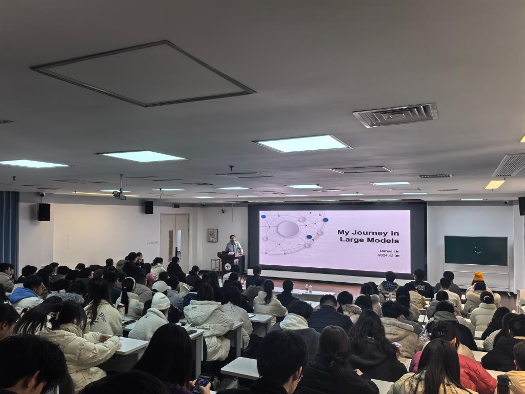 随后,林达华教授在致远厅为我校师生带来了一场题为“多模态大模型的实践与前瞻”的高水平前沿报告。在报告中,林达华教授深入剖析了多模态模型的架构、训练、部署及评测的实践观察,并详细阐述了在具体实践中所遇到的多重挑战。在此基础上,林教授还分享了他对于大模型未来技术演进和产业发展的独到见解,以及企业和学术界如何有效协同以促进科技创新的前瞻思考。