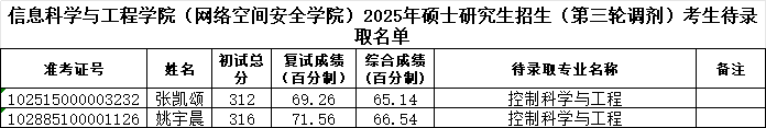 信息科学与工程学院(网络空间安全学院)2025年硕士研究生招生第三批调剂考生拟录取名单