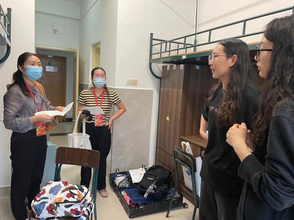 走访过程中,学院领导与学生亲切交谈,关心学生返校报到是否顺利,到校后是否适应新环境,鼓励他们养成健康的生活习惯,在寝室里积极营造互帮互助、团结文明、阳光向上的良好氛围。同时,希望大家做好大学四年生涯规划,增强自律,做好时间管理,争取学有所成。学院领导还询问迎新志愿者的帮助是否到位,并希望新生们将志愿者们的奉献、友爱、互助的精神一级一级传承下去。此外,辅导员、班主任还重点强调了寝室用电安全、谨防推销网络诈骗、提高自我防范意识等方面的注意事项。