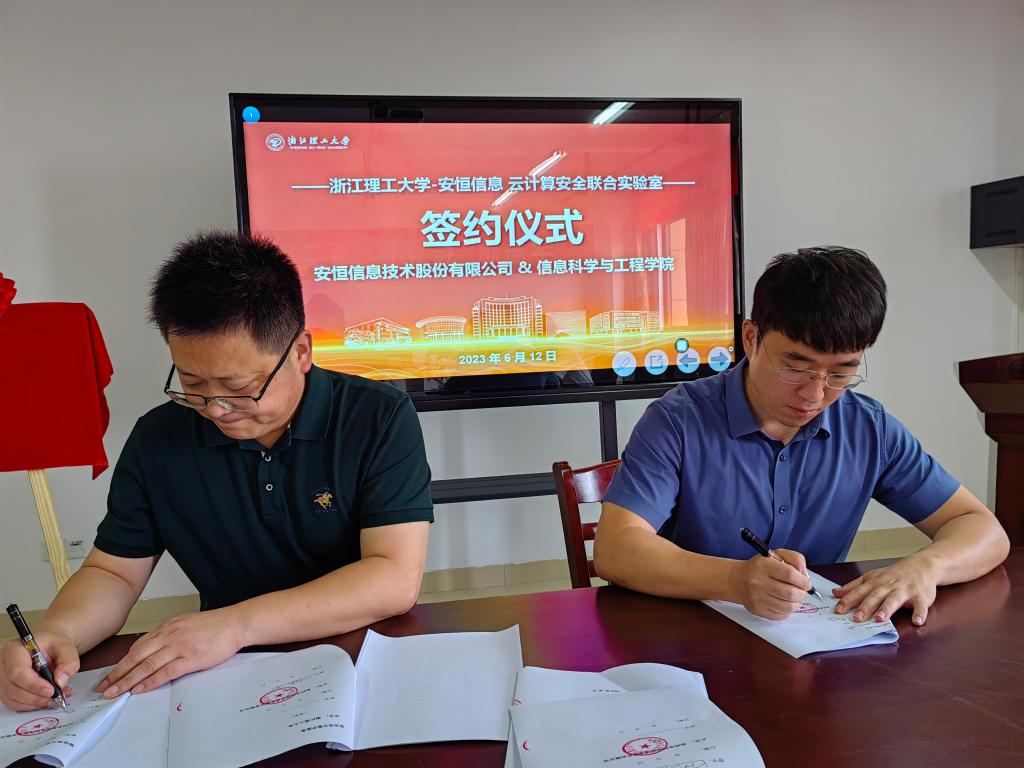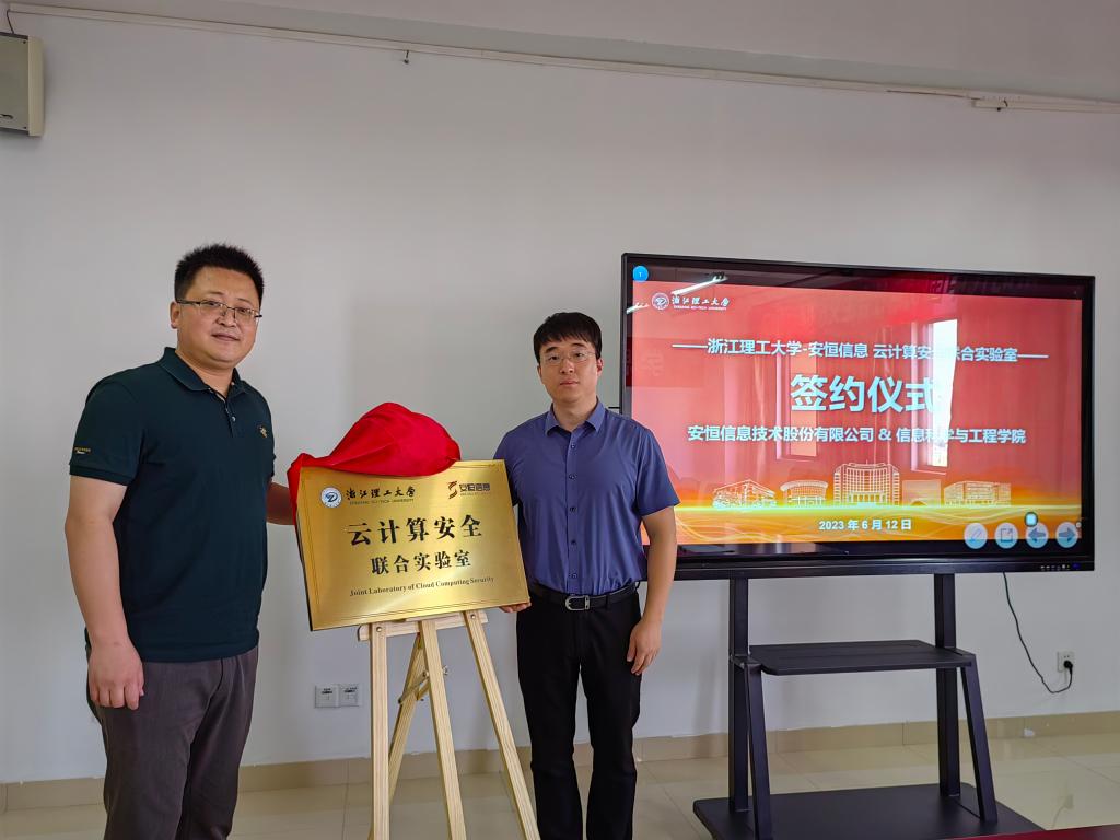 与安恒信息技术股份有限公司签约成立云计算安全联合实验室。科技处副处长吴震宇、学院党委书记苏丽辉、院长沈剑、副院长童基均、赵新龙、副书记许丽芬出席签约仪式。安恒信息技术股份有限公司高级副总裁兼首席人才官苗春雨、副总裁兼数字人才创研院副院长吴鸣旦、浙江区域教育医疗负责人彭实与高级副总裁助理杜妍参加签约。