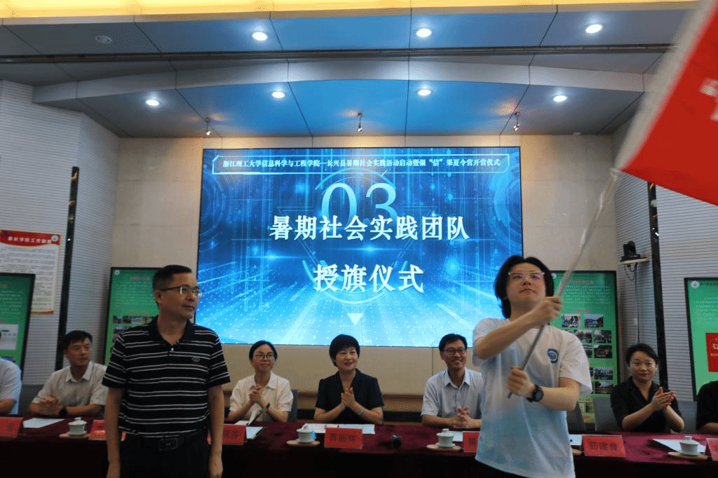 茹建良向“‘长’科学之识,‘兴’红色之风”暑期社会实践团授旗,实践团王瑞同学作代表发言,团队成员将以多样化的教学手段扎实推进本次实践活动。