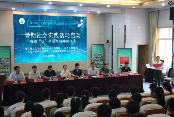 长兴暑期社会实践活动暨银“信”果夏令营启动仪式在长兴县水口乡中心小学报告厅举行。学院党委书记苏丽辉、党委副书记许丽芬、长兴县教育局党委委员、副局长吴涛、长兴县科协副主席茹建良、长兴县水口乡中心小学校长徐建忠、新四军苏浙军区纪念馆办公室主任徐丽霞、浙江井林建设有限公司副总经理高有华等领导出席,现场120余名师生共同参与活动。