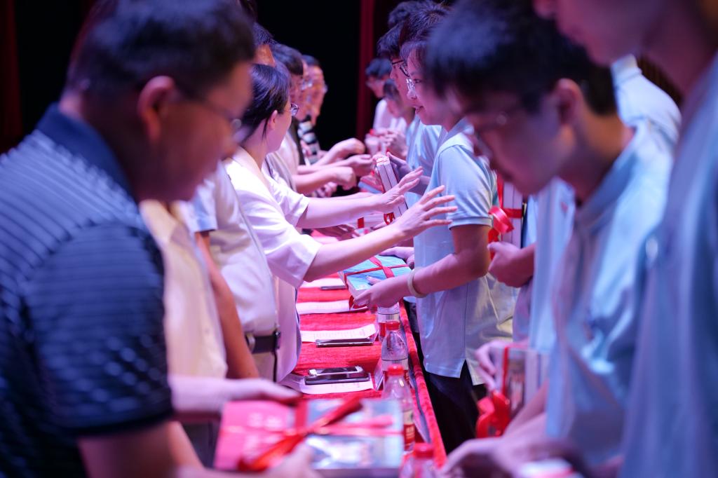 主席台领导为本科生、研究生学生代表佩戴校徽,赠送书籍《习近平与大学生朋友们》和《终身学习》。最后,全体新生进行了庄严的入学宣誓。