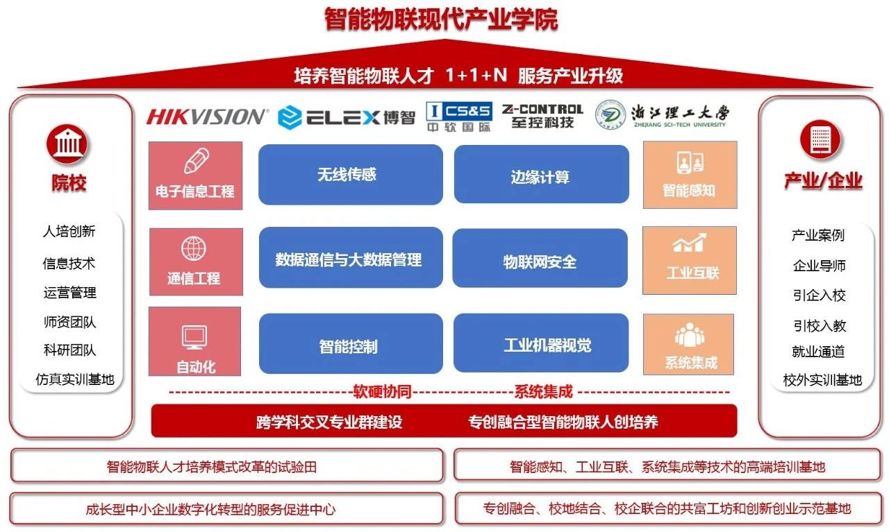 智能物联产业学院基于我校信息科学与工程学院(网络空间安全学院)电子信息工程、自动化、通信工程等专业,依托全省数字时尚与数据治理重点实验室、全省智能物联网络与数据安全重点实验室、浙江省云计算安全与数据聚合国际科技合作基地等平台,与杭州海康威视数字技术股份有限公司、博智安全科技股份有限公司、北京中软国际教育科技股份有限公司、浙江至控科技有限公司联合建设,紧密围绕“产教深度融合、学科交叉创新、服务地方经济”目标,培养契合智能物联产业需求的具有系统思维、工程能力和创新意识的复合型人才。