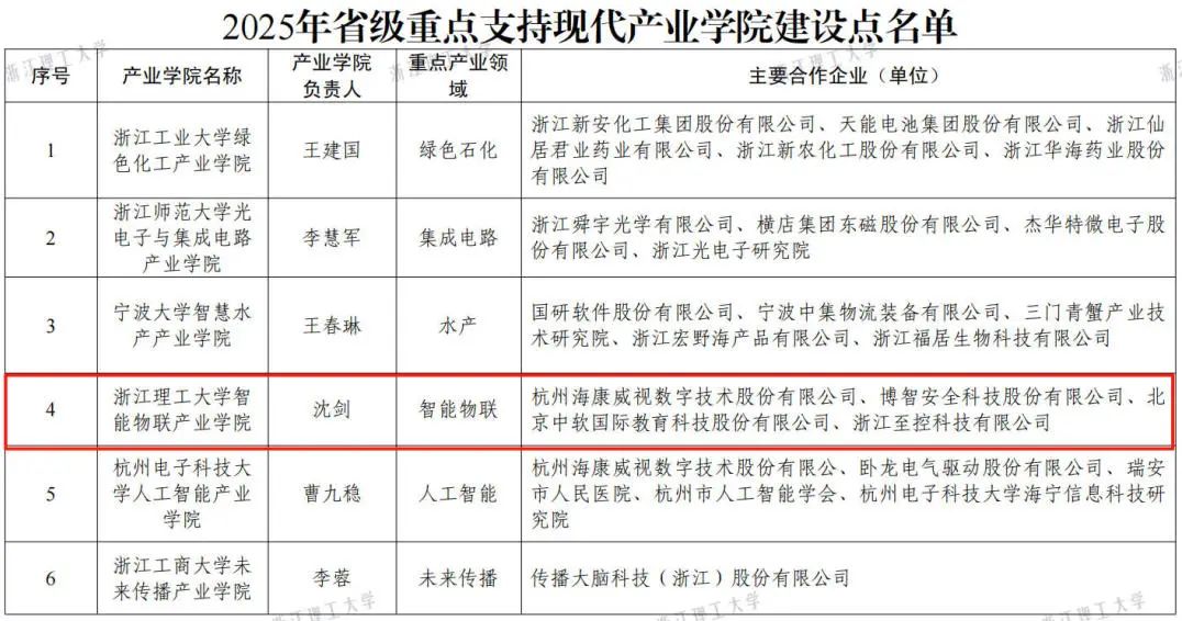 近日,浙江省教育厅办公室和浙江省经济和信息化厅办公室联合发文,公布了2025年省级重点支持现代产业学院建设点名单(浙教办函〔2025〕102号),我校申报的智能物联产业学院获批立项。