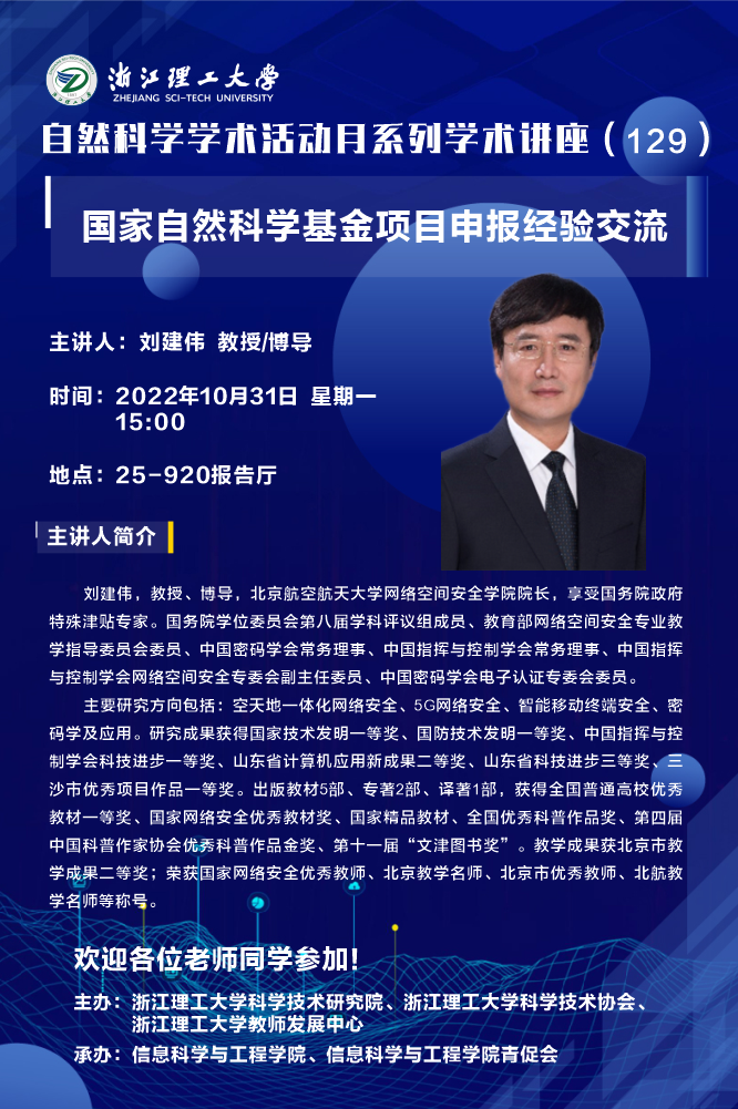 2022年10月31日下午,我院组织召开国家自然科学基金项目申报动员会暨自然科学学术活动月系列学术讲座。本次会议有幸邀请北京航空航天大学网络空间安全学院院长刘建伟教授为我院教师分享国家基金申请经验。北京航空航天大学吕继强、信息科学与工程学院院长沈剑,信息科学与工程学院副院长童基均、赵新龙,浙江理工大学科技处赵磊、周艺艺出席会议。会议由院长沈剑主持。