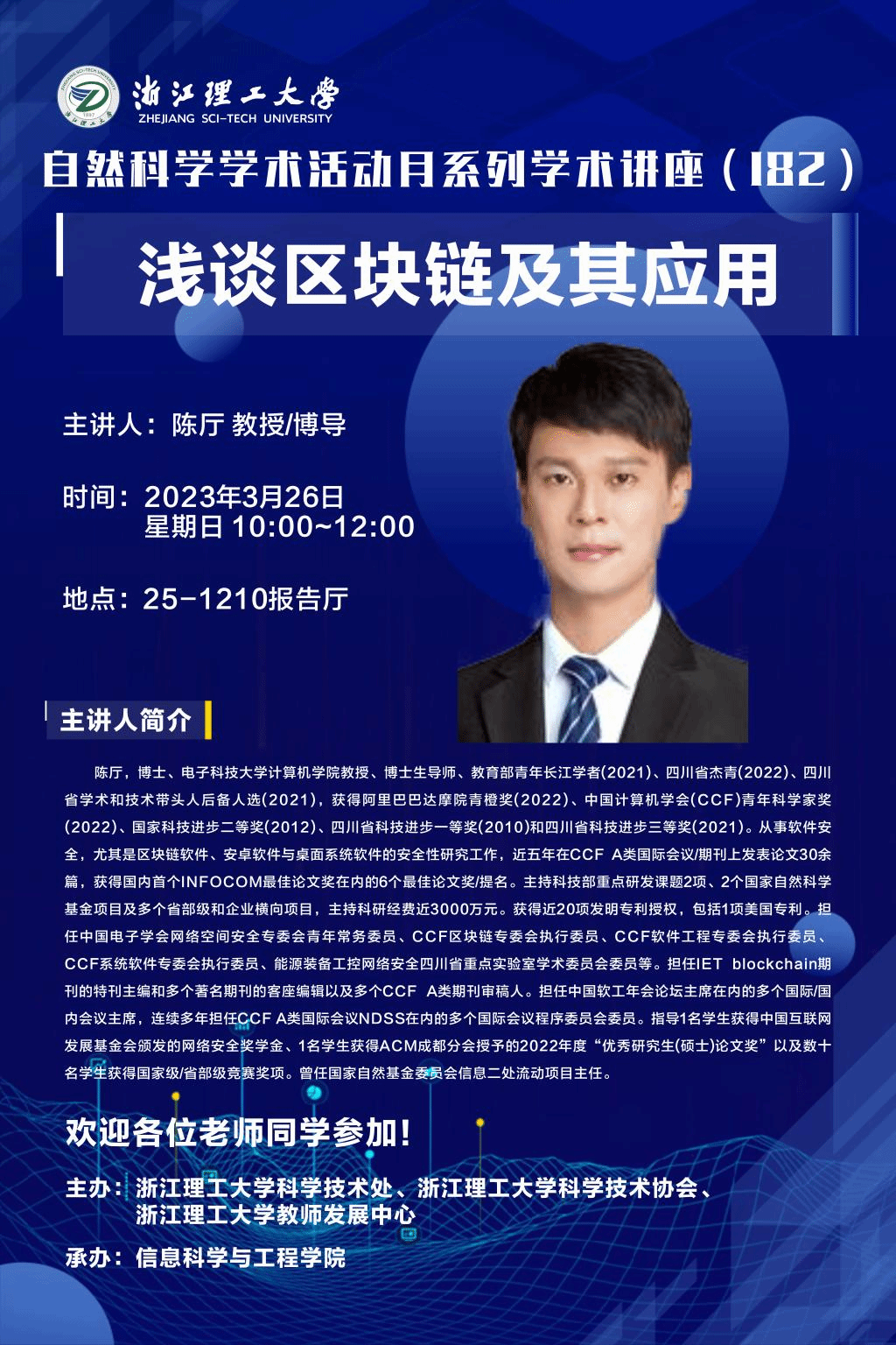 陈厅教授和伍前红教授围绕“区块链的技术本质、核心特性、主要分类和发展历程”为我院青年教师和在读研究生做了题为《浅谈区块链及其应用》的学术报告。