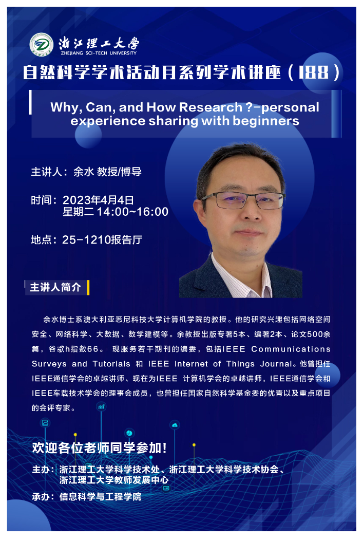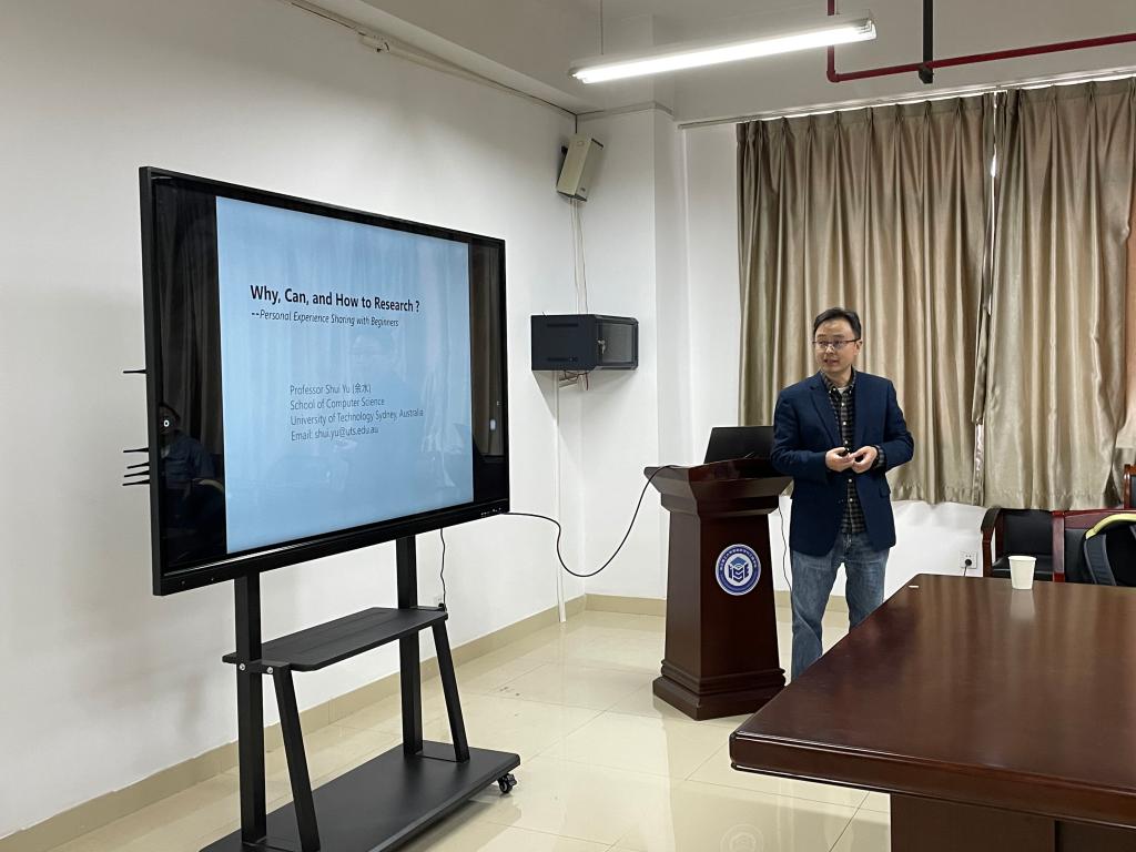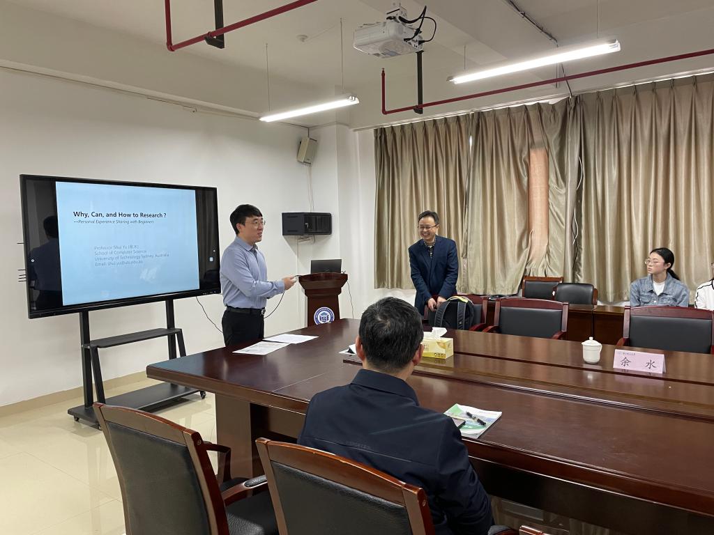2023年4月4日,星期二,下午14:00,澳大利亚悉尼科技大学计算机学院余水教授来我院进行学术交流,为我院青年教师和在读研究生做了题为《Why, Can, and How Research ?-personal experience sharing with beginners》的学术报告,本次会议由信息科学与工程学院院长沈剑主持,童基均副院长、高金凤教授(院长助理)出席。