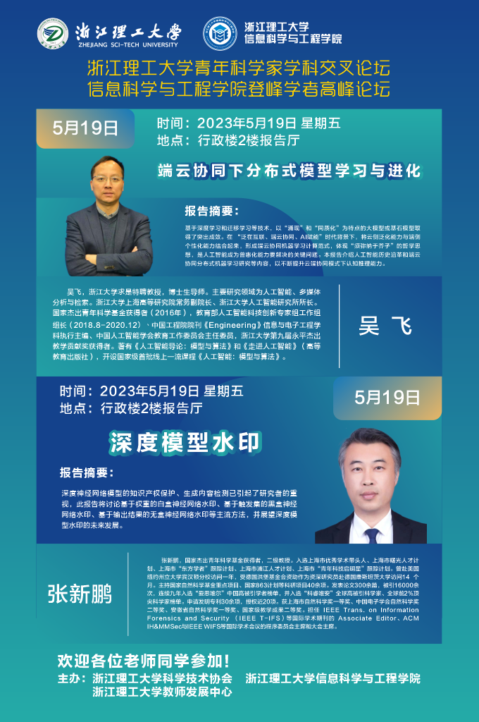 5月19日上午,在1号楼2层报告厅信息科学与工程学院举办第二期登峰学者高峰论坛活动,邀请了9位国家级人才来校作前沿讲座。专家分别是上海交通大学陈贵海教授、南京理工大学徐胜元教授、张新鹏教授、吴飞教授、西安电子科技大学陈晓峰教授、浙江工业大学梁荣华教授、北京理工大学刘驰教授、南京大学谢磊教授、南京邮电大学王化群教授。王剑俊副校长致欢迎辞、杨晓刚院长主持开幕式。