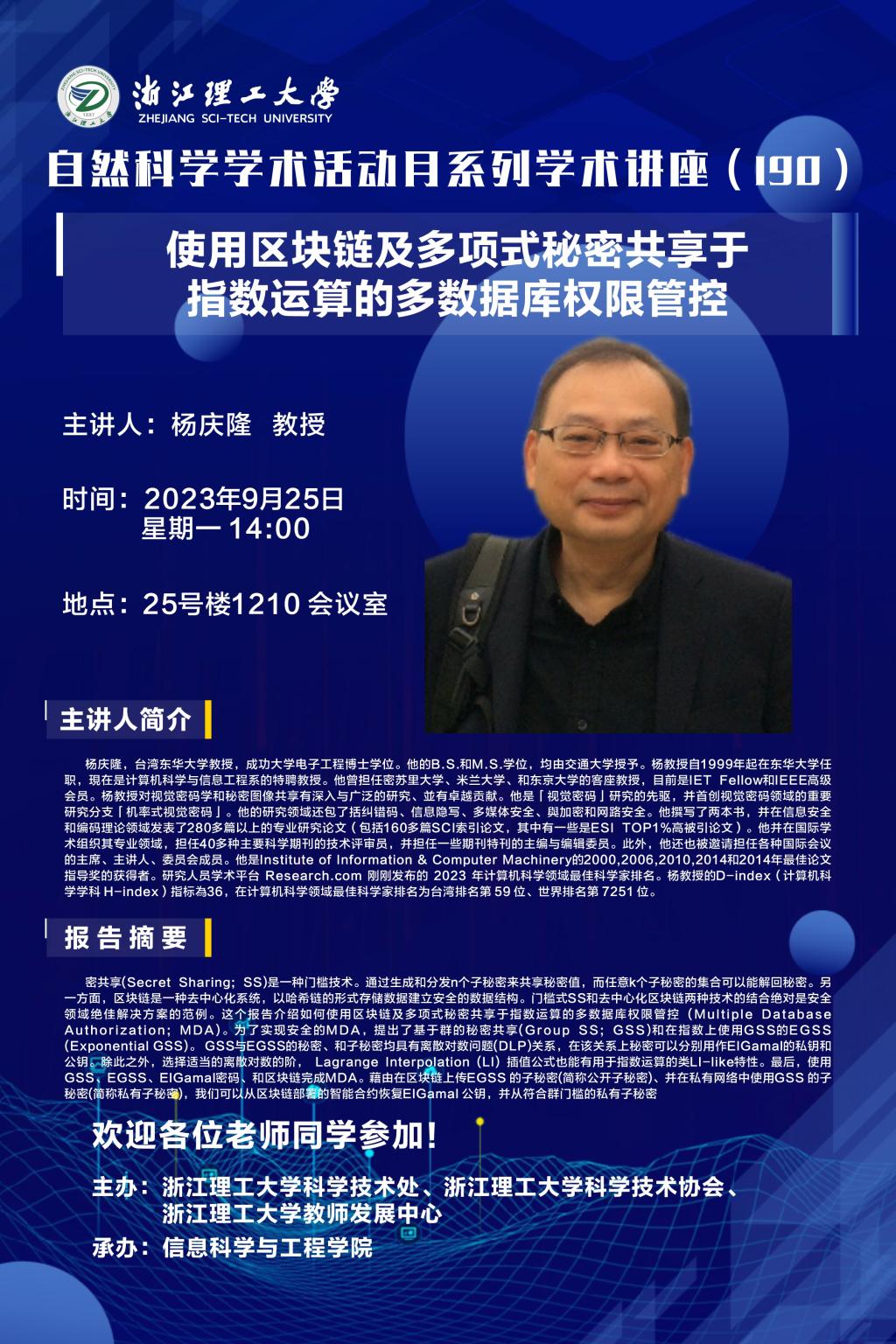 2023年9月25日下午,信息科学与工程学院邀请了台湾东华大学杨庆隆教授来访并作前沿学术报告“使用区块链及多项式秘密共享于指数运算的多数据库权限管控”。