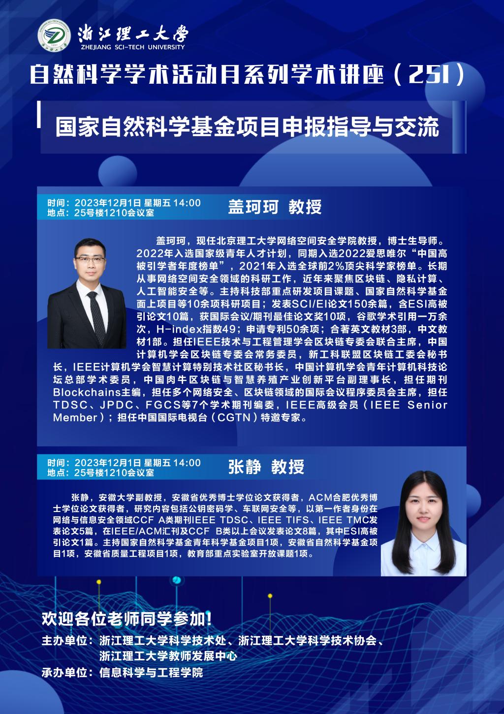 为进一步提高我院2024年度国家自然科学基金项目申报质量,12月1日下午14:00在25-1210会议室,学院组织开展了国家自然科学基金项目申报专家现场辅导。分别邀请了邵俊教授、任艳丽教授、张静教授来校进行现场指导。本次会议由信息科学与工程学院沈剑院长主持。