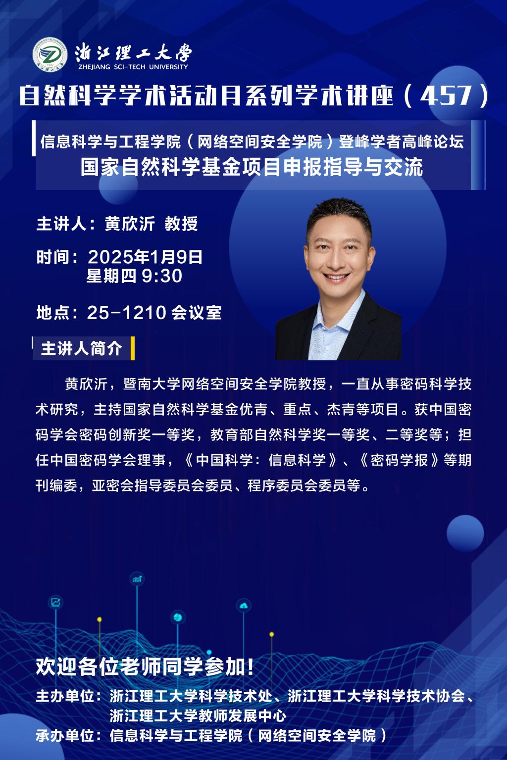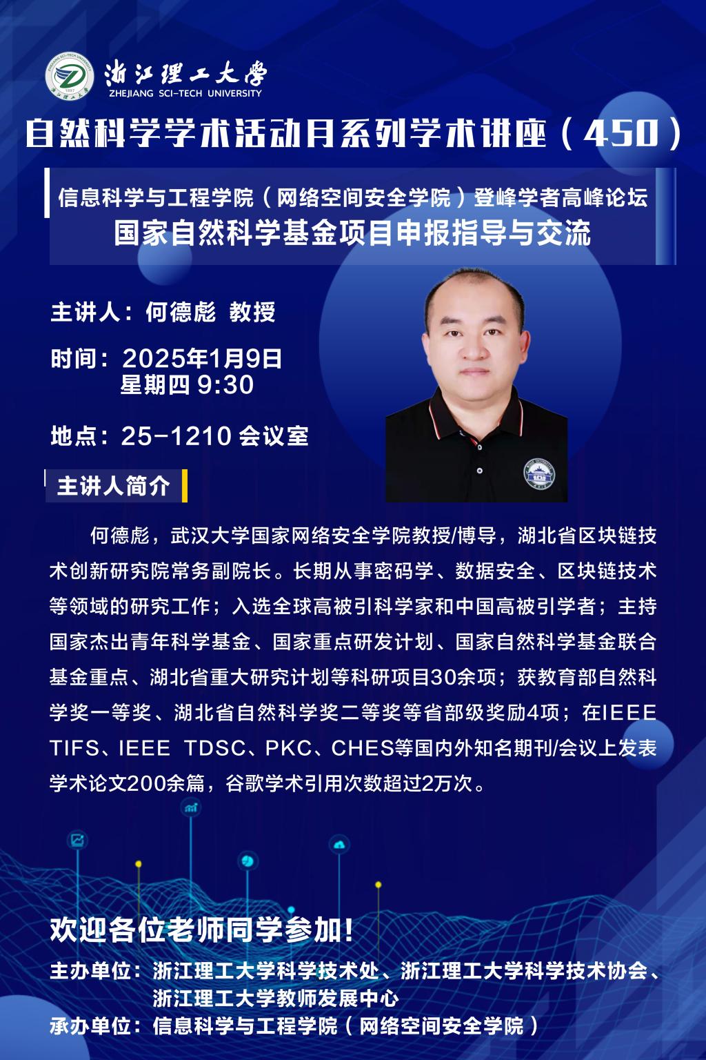 2025年1月9日上午,色色啦 (网络空间安全学院)登峰学者高峰论坛(第三期)在25号楼1210会议室举行。本次学术交流活动主要围绕“国家自然科学基金项目申报指导与交流”展开。学院邀请武汉大学国家网络安全学院何德彪教授、中国民航大学杨宏宇教授、暨南大学网络空间安全学院黄欣沂教授、武汉大学国家网络安全学院罗敏教授、澳门城市大学数据科学学院朱天清教授、北京信安世纪科技股份有限公司研发副总裁胡进博士为学院2025年申报国家自科科学基金项目的老师进行现场指导。