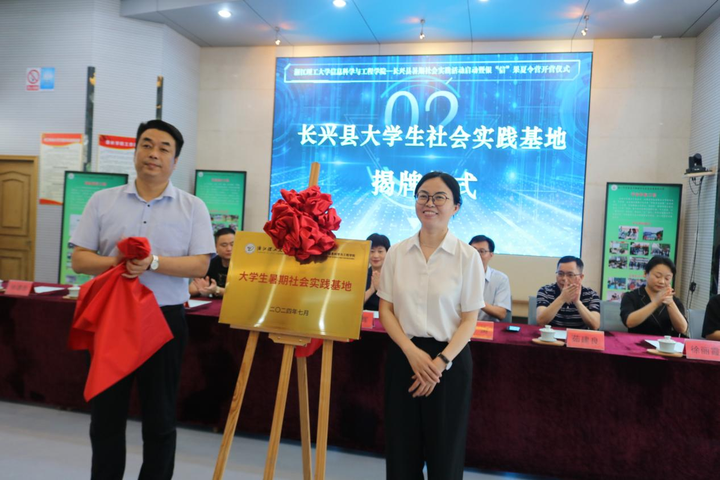 浙江理工大学信息科学与工程学院党委副书记许丽芬与长兴县水口乡小学校长徐建忠共同为大学生社会实践基地揭牌。